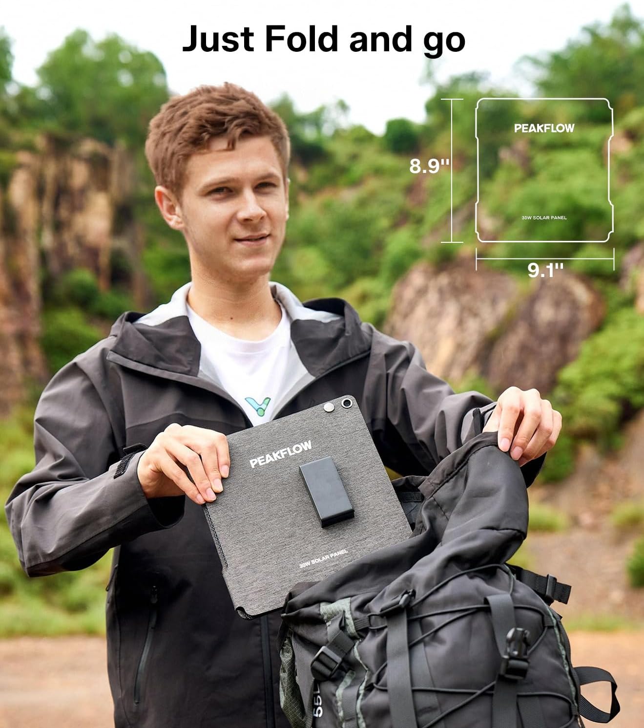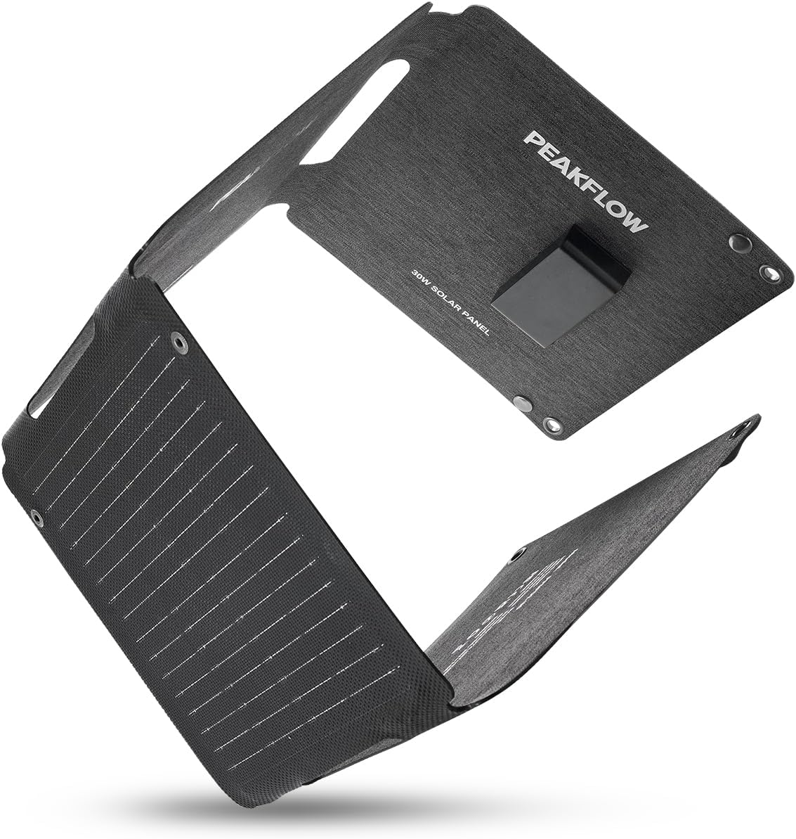 PEAKFLOW 30W Solar Panel,Foldable Portable Solar Panel,25.4% High-Efficiency, USB-A and 2 USB-C Ports, Folding IP 68 Waterproof Solar Panels with Carabiners for Camping