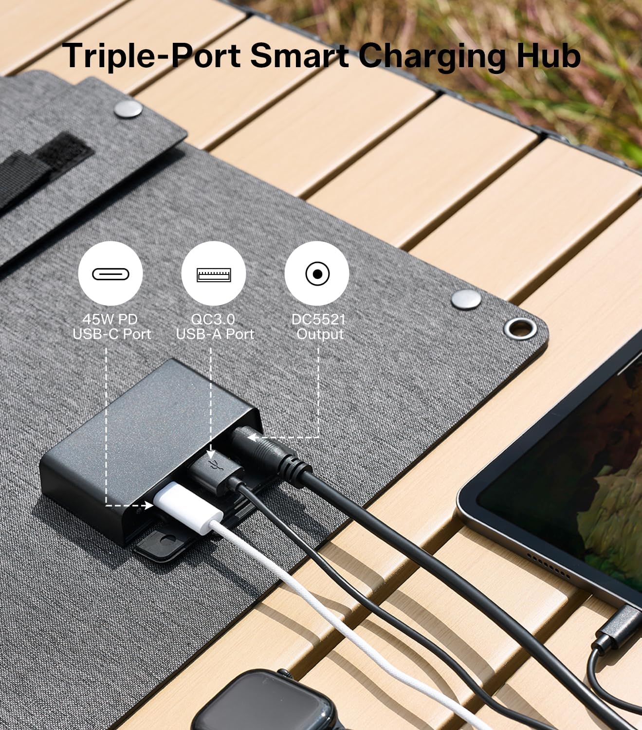 - Triple-Port Smart Charging: Power Multiple Devices Simultaneously 25W PD USB-C Port and USB-C Port: Ideal for low-power devices including smartphones,headphones, and smartwatches. QC 3.0 USB-A Port: Supports fast charging for smartphones and tablets. Whether you’re working outdoors or traveling with a group, this single solar panel meets all your devices’ power needs. *Please Note: This product can't store the electricity; it must be used in direct sunlight while connected to your devices