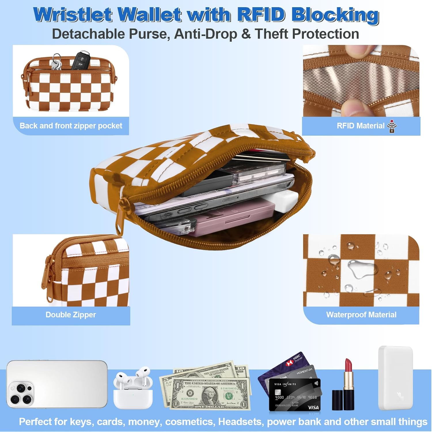 - Detachable RFID Wallet: This versatile wristlet wallet (7.2" L x 4.5" W x 1.4" H) is crafted from durable, waterpoof nylon and features RFID-blocking technology to protetct your cards from unauthorized scanning. It offers ample storage space - with 3 zippered compartments, a large main pocket, interior open pocket, 3 card slots, interior slip pocket, rear zip pocket, and front zip pocket. keep your essentials organized, secure, and easily accessible—perfect for travel, errands, or everyday use!