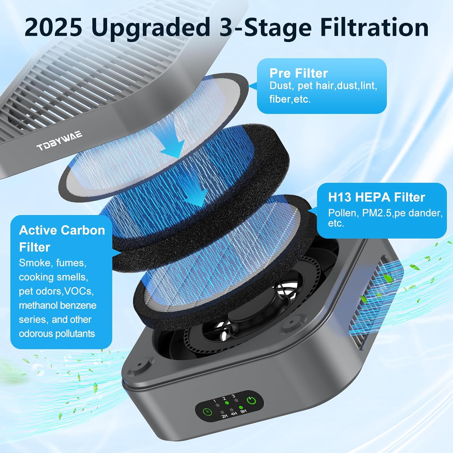 - 【H13 True HEPA Air Purifier】TDBYWAE air purifier for home has a 3-stage filtration system and consists of a pre-filter, a true HEPA filter, and an activated carbon filter. Effectively purify most air pollution, including dust, pollen, smoke, odors, PM 2.5 and pet danders. The filter included has been upgraded with better material