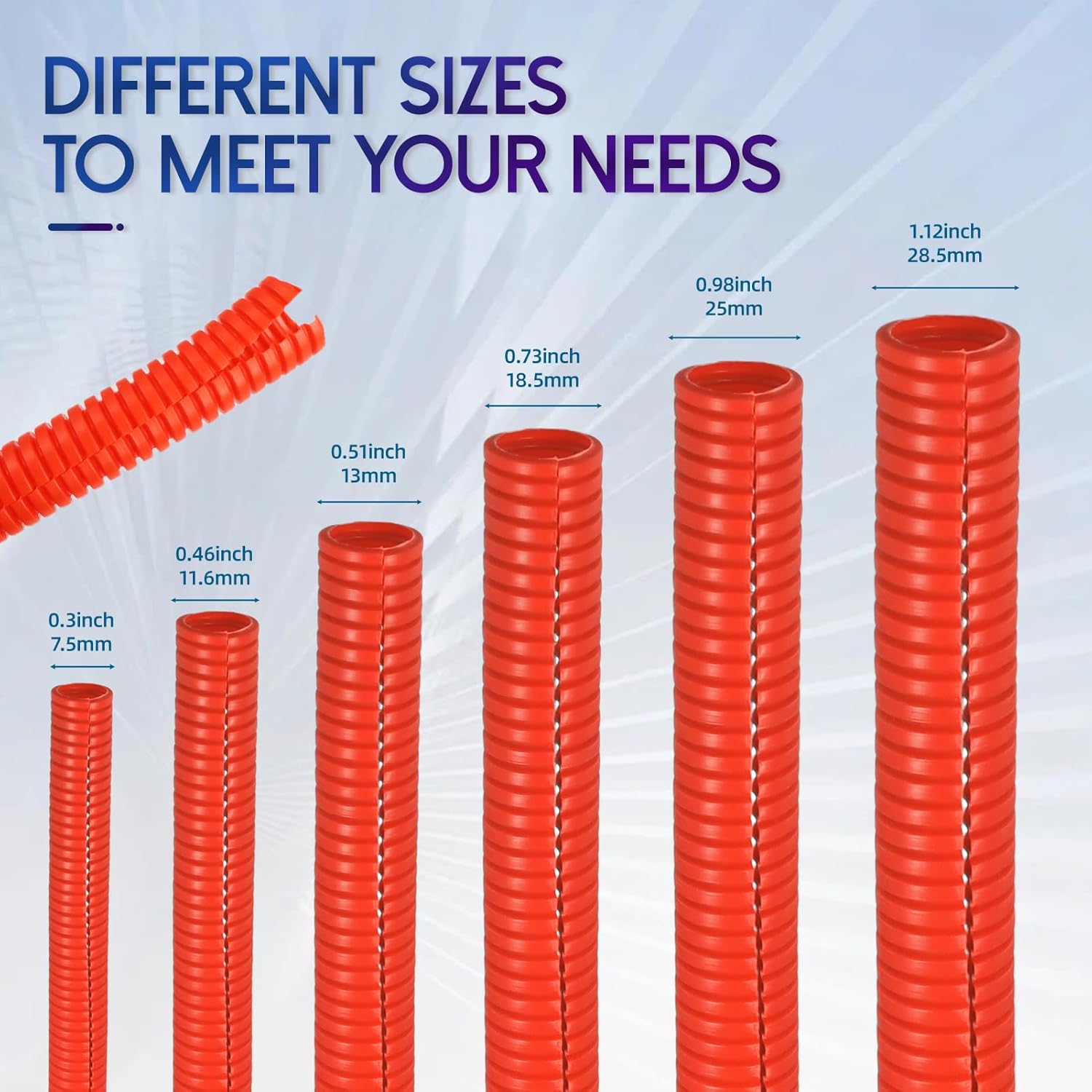 - MORE COLOR AND SIZE: Our wire loom are available in a variety of colors and sizes for you to choose from: black, gray, blue, green, red, yellow. Each roll length has10ft, 25ft. Diameter Size has: 0.3in,0.46in,0.51in,0.73in,0.98in,1.12in(7.5mm,11.6mm,13mm,18.5mm,25mm,28.5mm). You can customize the length for cutting split wire loom and a wire management makes it easier to manage wires and wiring.