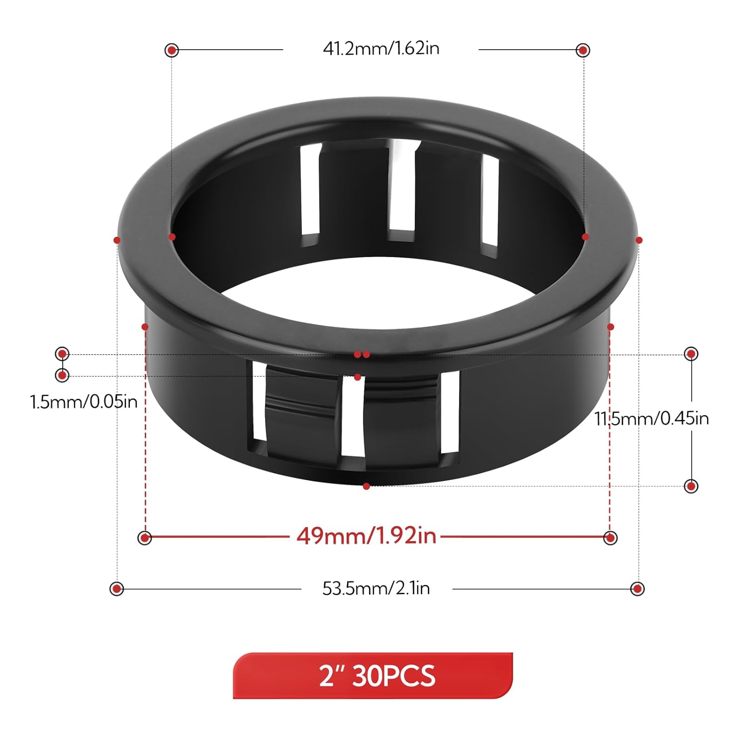 - Dimensions: Model SB-50 (30-piece pack), Inner Diameter: 1.6in (41mm) ; Outer Diameter: 2.1in(54mm) ; Height: 0.45in (11.5mm); Mounting Hole Diameter: 1.92in (50mm)