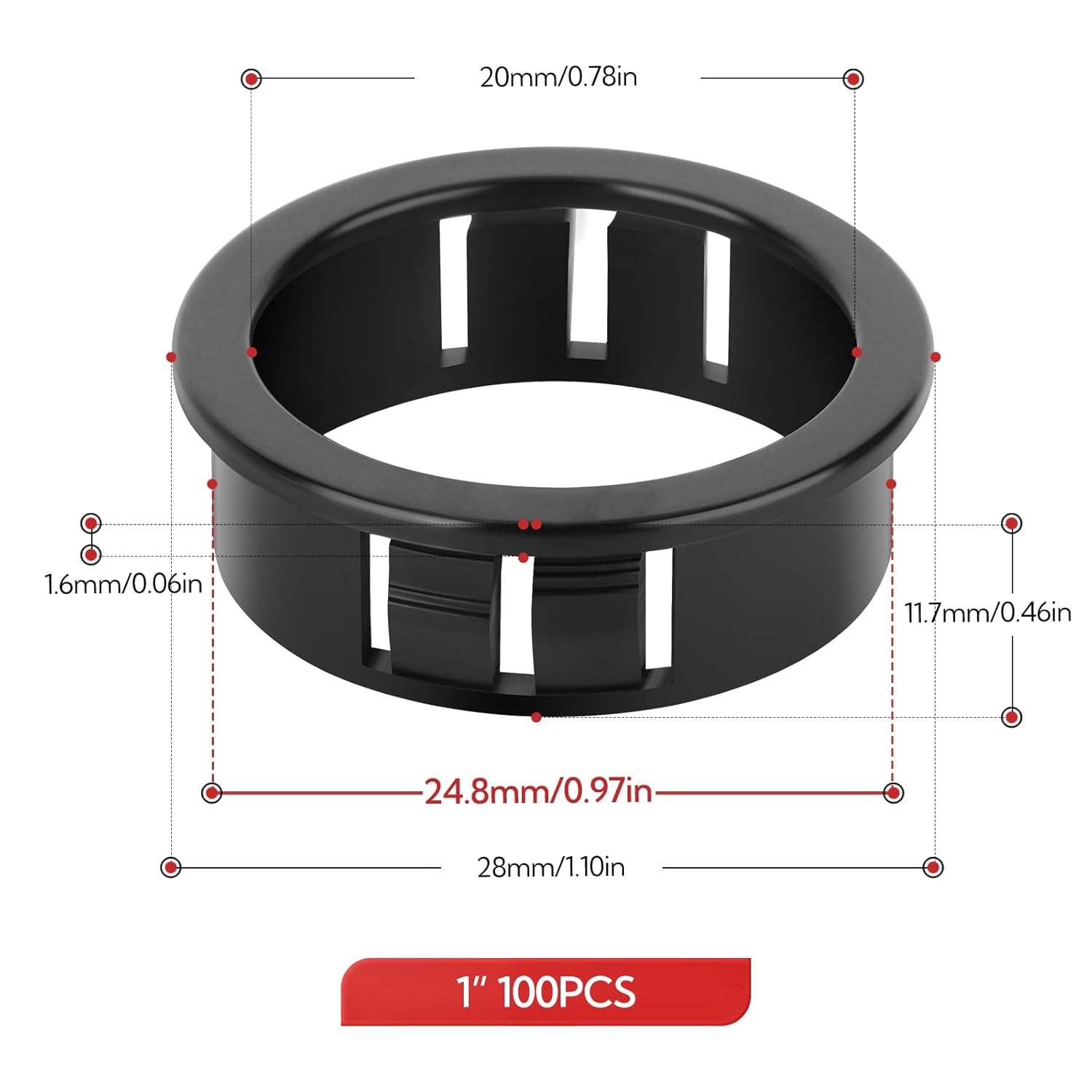 - Dimensions: Model SB-25 (100-piece pack), Inner Diameter: 0.78in (20mm); Outer Diameter: 1.1in(28mm); Height: 0.46in (11.8mm); Mounting Hole Diameter: 1in (25mm)