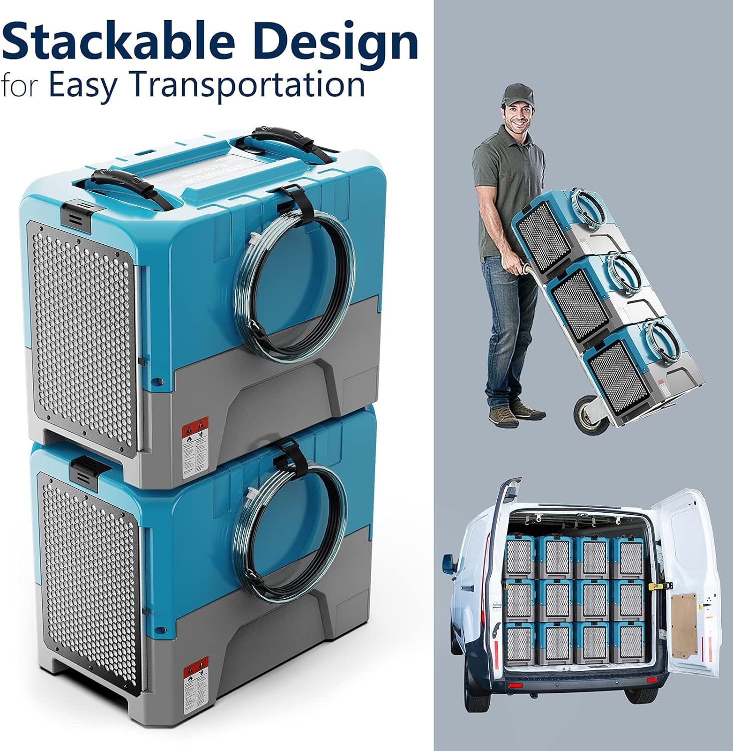 - App Control & Dry anywhere: MONITOR THE RESTORATION PROCESS ON THE GO! Our free AlorAir DryEasy mobile app is included with the unit upon purchase. Commercial Dehumidifier, Moisture Removal Capacity 180 PPD at Saturation condition and 85 Pint at AHAM only with 5.62A, Super-Efficient System, fits into small spaces, Secure, compact stacking – transport multiple units on a hand truck