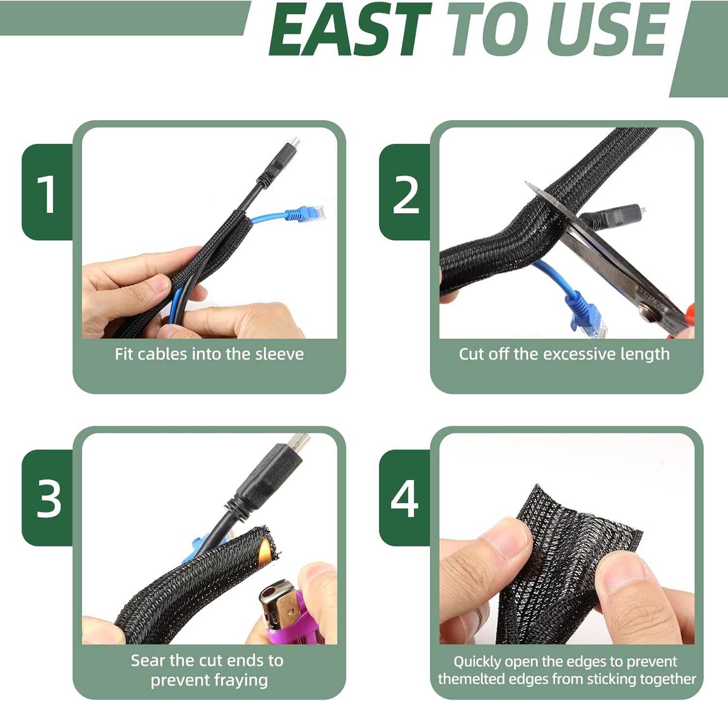 - MULTIPLE APPLICATIONS: Our cord sleeve ensures that wires stay tidy and reduces clutter and tripping hazards, making them ideal for desks, TVs, gaming setups, routers, and car wiring. Ideal for organizing and protecting cables in home, office, or industrial applications.
