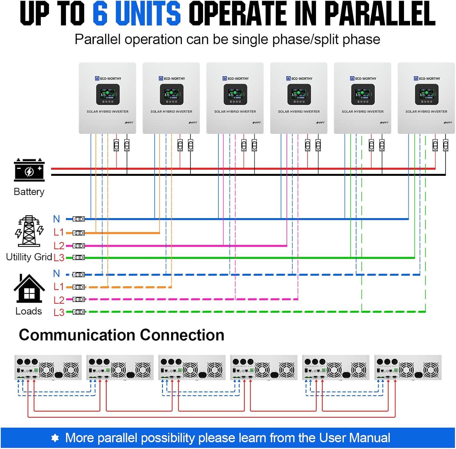 - Flexible Parallel Operation: The 5KW inverter supports parallel operation of up to 6 units (30KW max). Single-phase or split-phase parallel options allow output of 120V/208V/240V, making it adaptable for different household and commercial power needs.