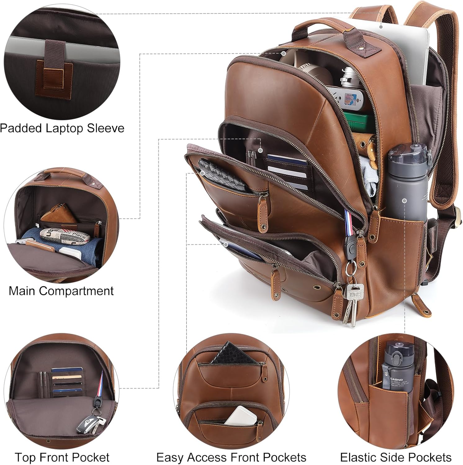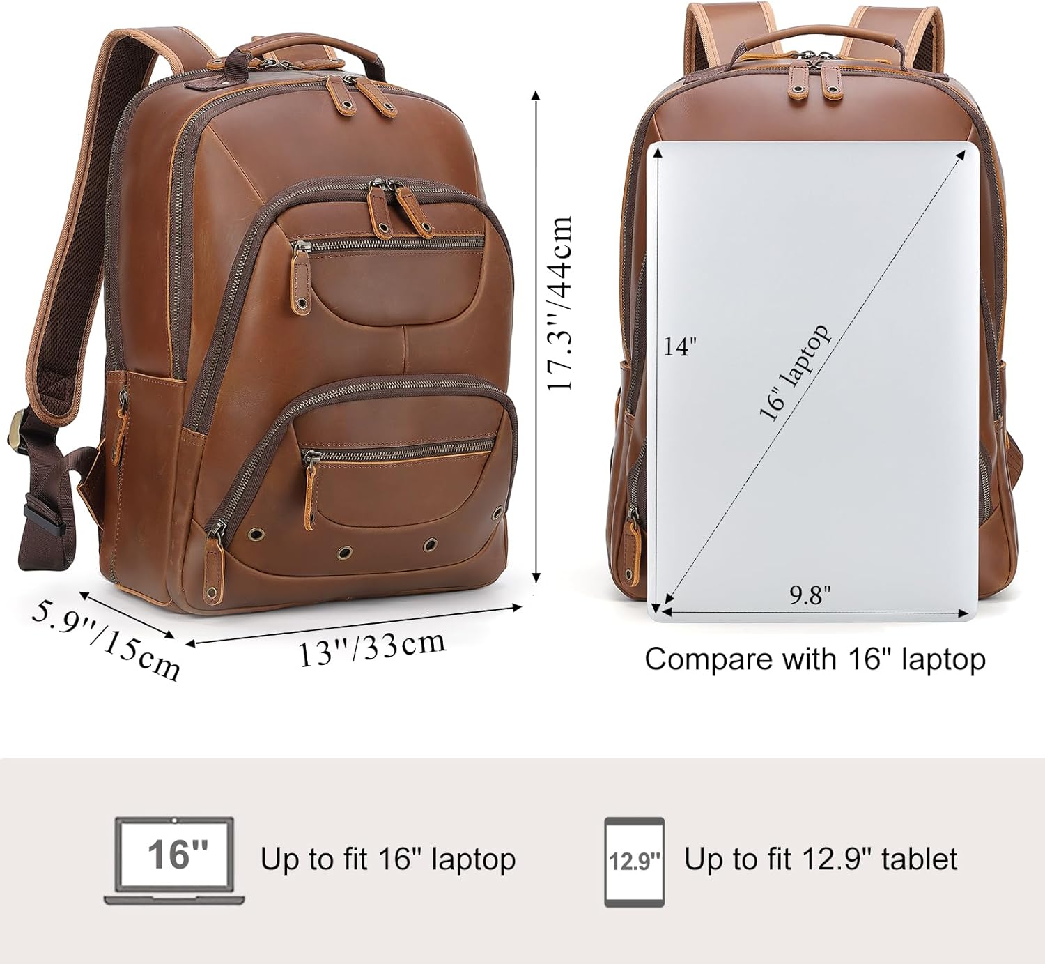 - 【Premium Craftsmanship】This brown leather laptop backpack is made of 2mm thick full grain cowhide leather, with ykk metal zippers, tear-resistant polyester lining and reinforced stitching. The leather will develops a unique patina over time and use, adding charm to your backpack and catch the compliments