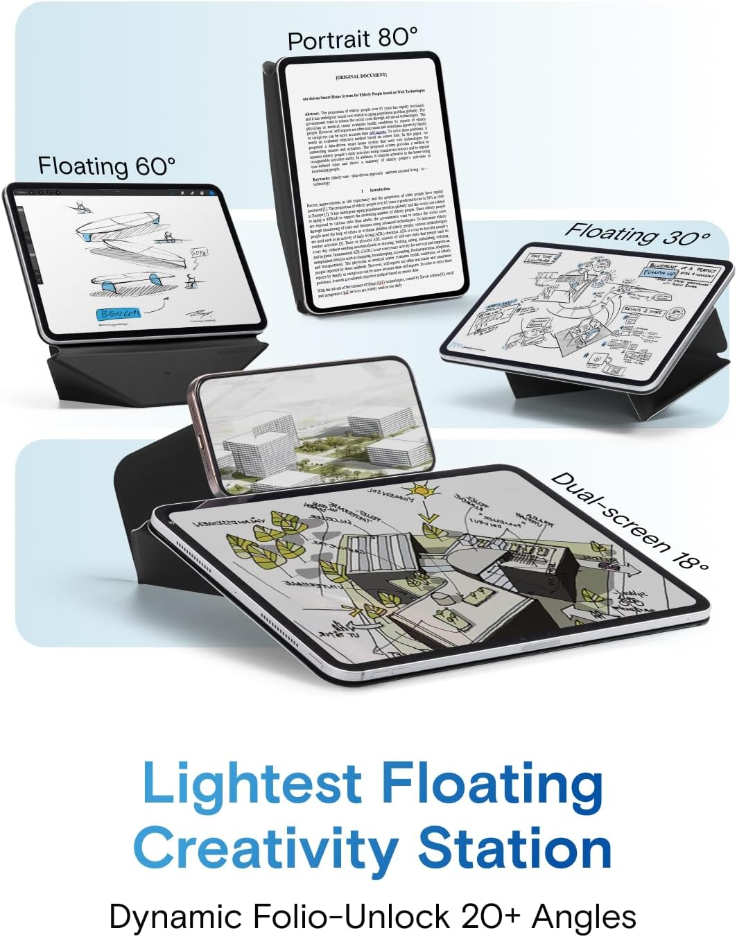 - Ultimate Ergonomic Floating Modes - MOFT Dynamic Folio Case makes iPad ergonomics effortless for mobile creativity - featuring a single-piece structure that effortlessly folds into a workstation lifting iPads up 2-inches. Frictionless angle shifts between 30° and 60° keep you aligned in your input-output framework.