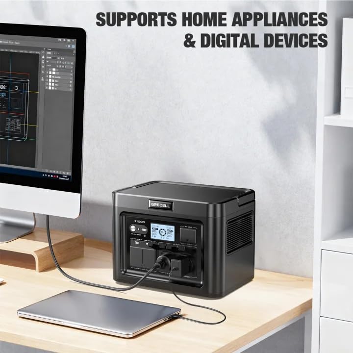 GRECELL Portable Power Station 1200W 672Wh H1200 LiFePO4 Battery Solar Generator with 10ms UPS, 1200W Solar Power Station, 9 Output Ports for Home Emergency, Outdoor Camping, RV Travel, Laptop TV